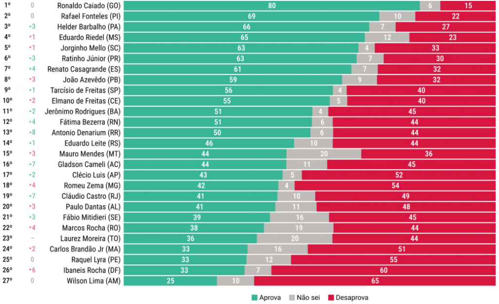Na liderança do ranking aparece o governador de Goiás, Ronaldo Caiado, com aprovação superior a 80%. Em seguida estão Rafael Fonteles (PT), do Piauí, com 69% de aprovação, Helder Barbalho (MDB), do Pará, com 66%, e Eduardo Riedel (PP), do Mato Grosso do Sul, com 65%.