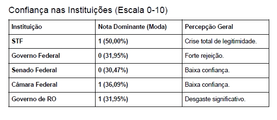 De acordo com os dados, a polícia aparece como a instituição mais respeitada pela população, com predominância de nota 8 (18,93%), indicando um nível de aprovação acima da média em comparação com outros serviços públicos. As polícias aparecem como instituições mais respeitadas na percepção da população de Rondônia.